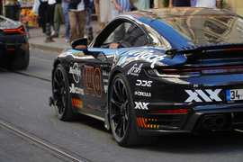 For braking, the EVO comes standard with carbon-ceramic brakes measuring 15 inches in diameter at both the front and rear, delivering exceptional stopping power and fade resistance. The standard wheel setup consists of center-lock forged alloys—20 inches at the front and 21 inches at the rear—shod with high-performance Michelin Pilot Sport Cup 2 R tires.